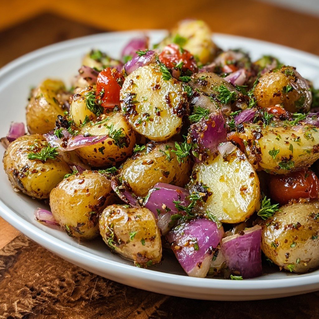 A fresh and flavorful potato salad tossed in a tangy balsamic vinaigrette with herbs, onions, and cherry tomatoes. Perfect for picnics, dinners, or as a light lunch option.