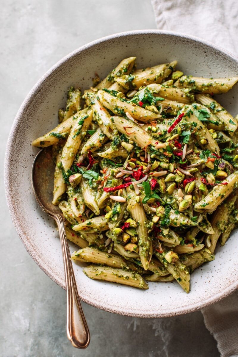 I swear, the first time I made this creamy 5 ingredient pistachio pesto pasta, I was just rummaging through the pantry after a long day and couldn’t deal with any recipe that required more than basic math or more than one pan. Pistachios? Check. A fairly suspect chunk of Parmesan? Sure. The basil plant on my windowsill that is both thriving and near death (the paradox of all home gardening)? You bet. Before I knew it, I was spooning the most gloriously green, creamy pesto over twirly noodles, and suddenly remembered how my Nonna used to say a good sauce fixes anything – even a linguine emergency at midnight. Anyway, if you’re reading this while hungry, fair warning: this comes together faster than you think!
