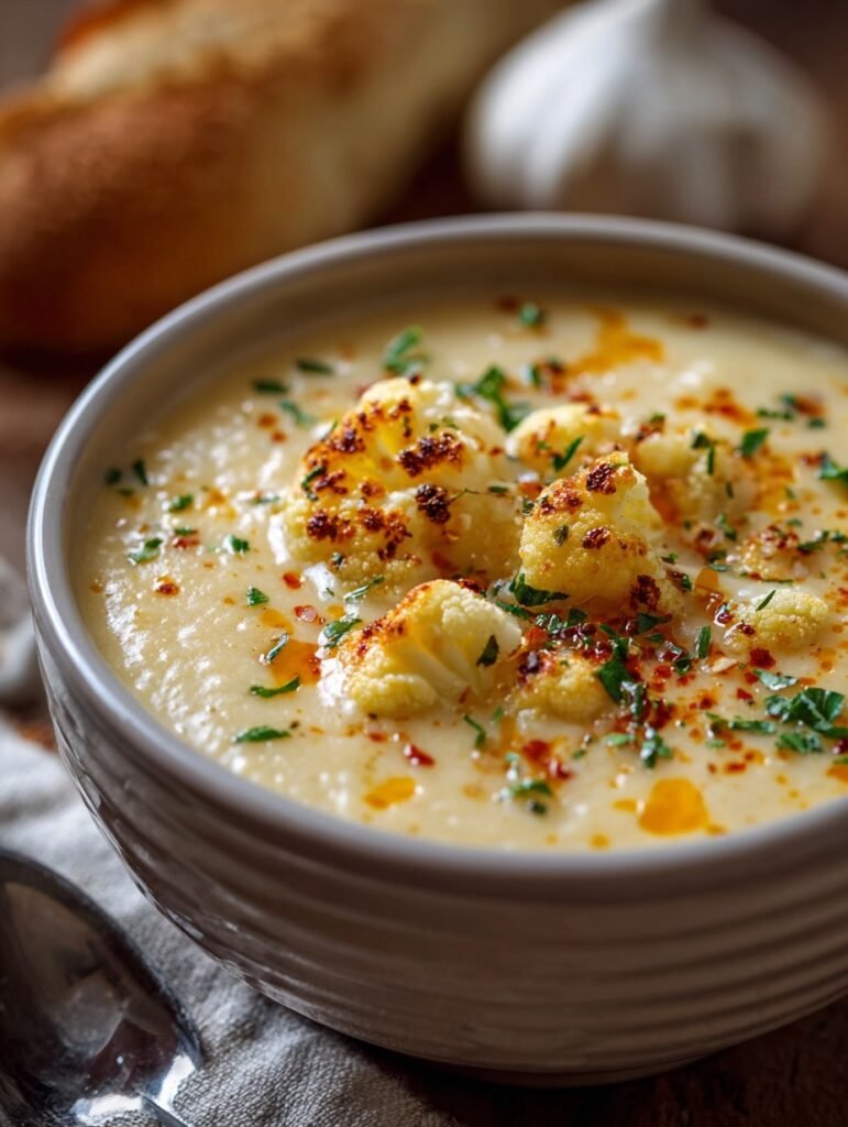 A comforting, velvety soup made with roasted garlic, tender cauliflower, and sharp cheddar cheese. Perfect for a cozy dinner or a light lunch.