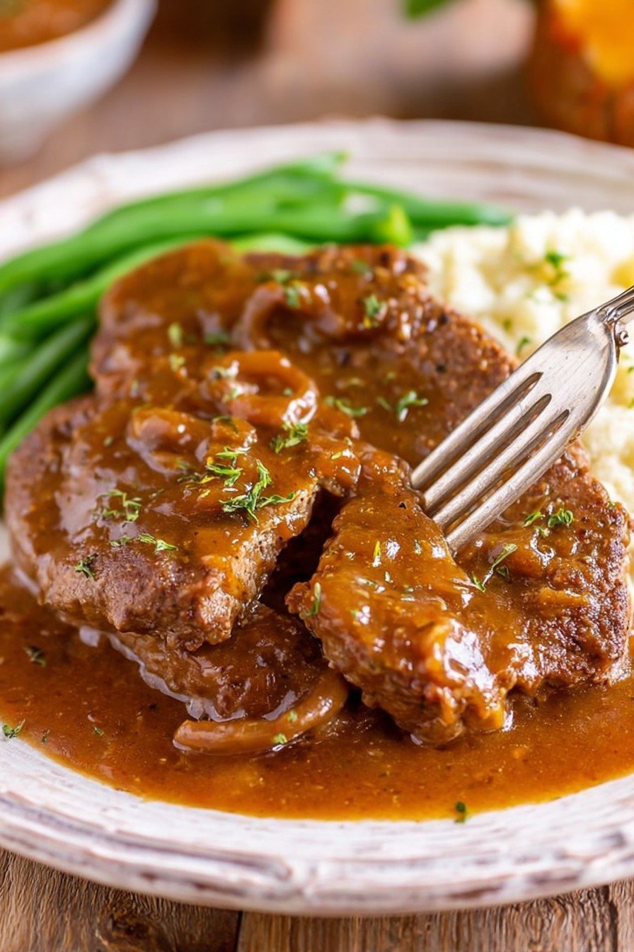 Tender cubed steak slow-cooked in a savory gravy with onions and mushrooms. This easy crock pot recipe delivers delicious, melt-in-your-mouth beef perfect for a hearty dinner.