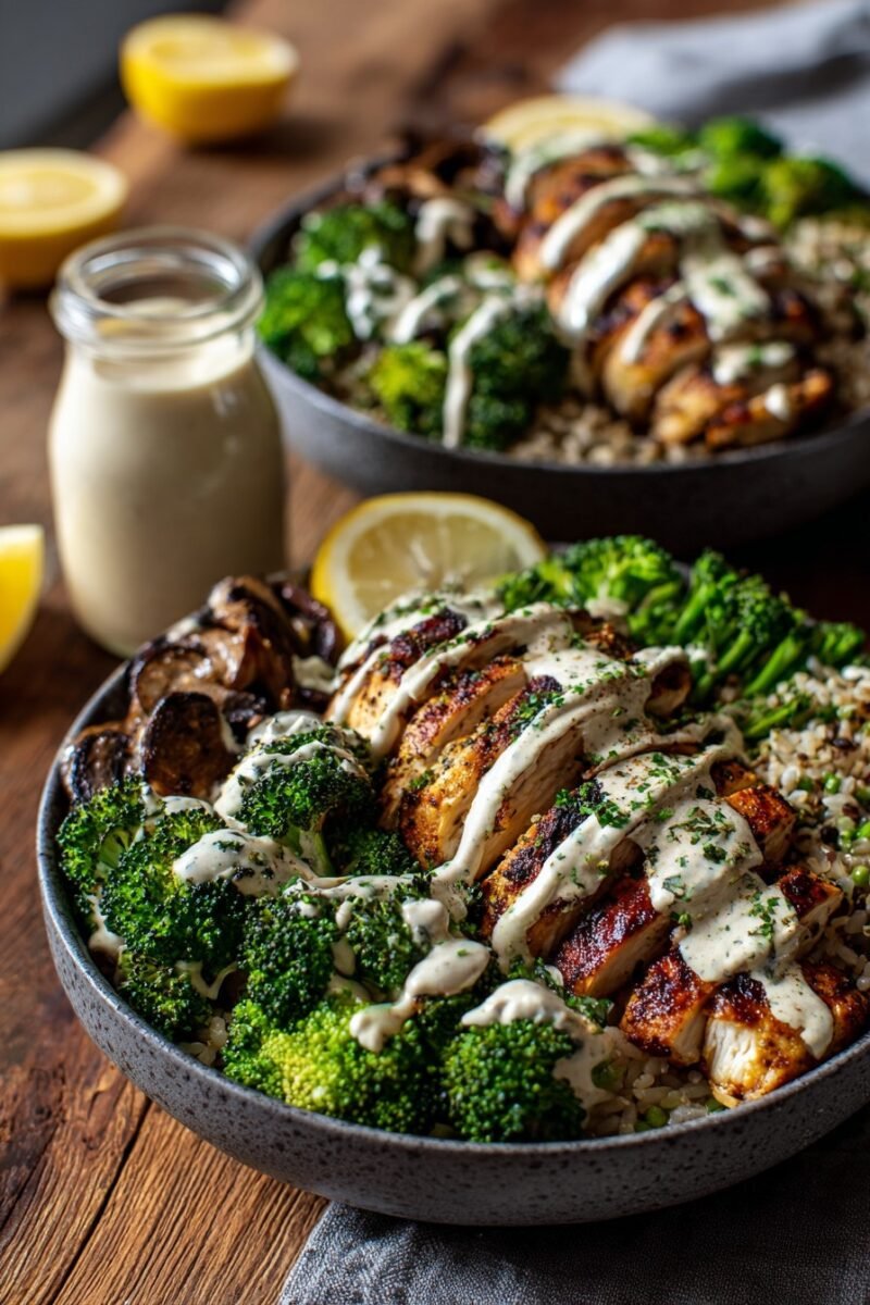 5To assemble the bowls, divide cooked rice among four serving bowls. Top with sliced grilled chicken and broccoli florets. Drizzle with the creamy garlic sauce.