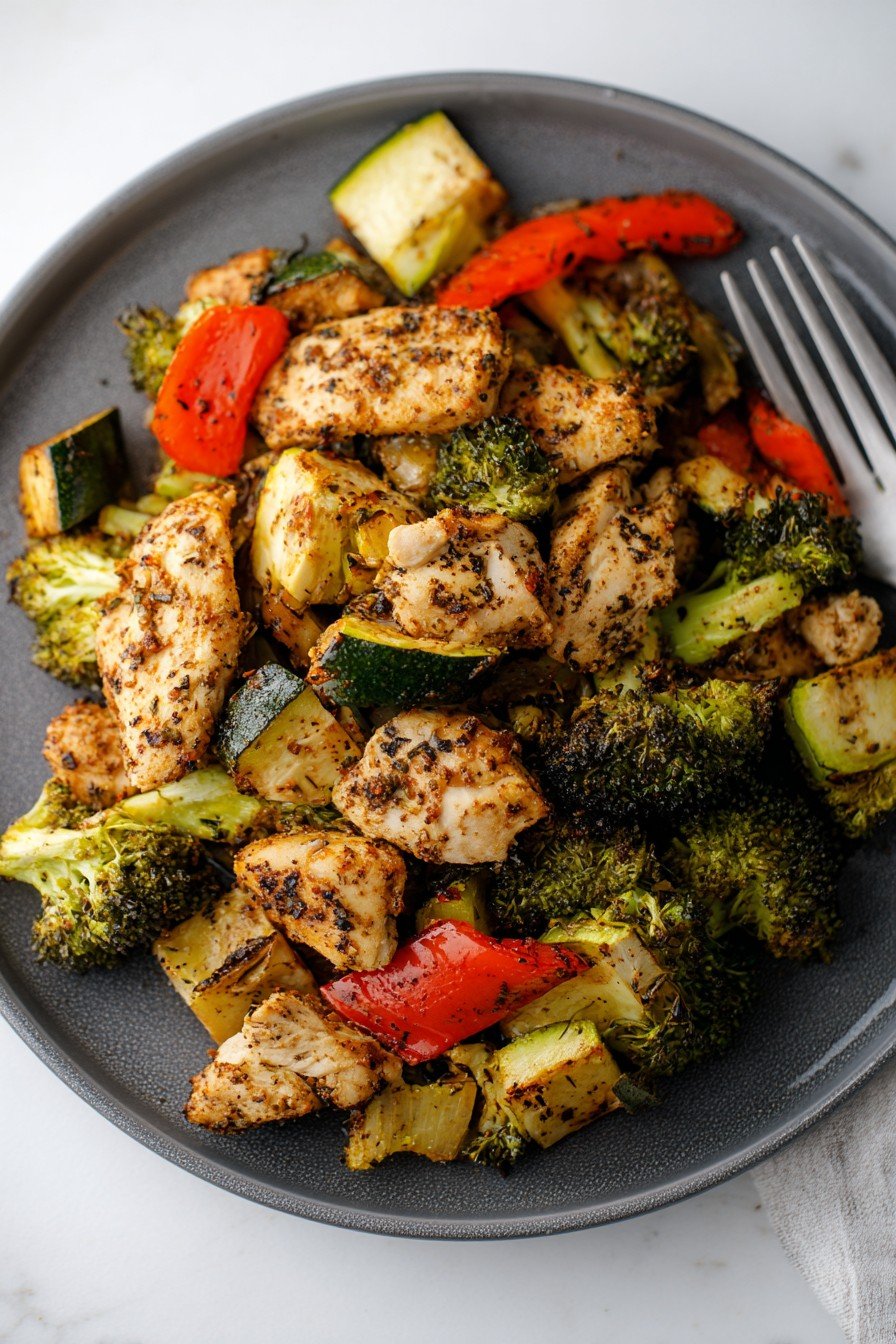 I make this when I’ve got a hodgepodge of random veggies and—let’s be honest—can’t face the mess that comes with pan frying. My family goes absolutely nuts for this, probably because the chicken gets all golden and juicy (no dry, weird bits here, thank you) and the veggies pick up a bit of that roast-y flavour.