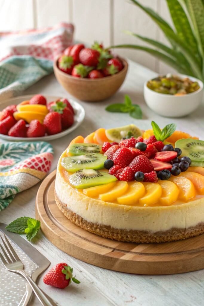 Indulge in the perfect balance of creamy cheesecake and fresh tropical fruit with this Tropical Fruit Symphony Cheesecake! Featuring a buttery graham cracker crust, rich cream cheese filling, and a colorful fruit topping, this dessert is a true showstopper.