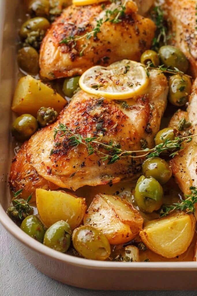 A savory and aromatic oven-baked chicken dish featuring tender chicken pieces, green olives, garlic, and fresh herbs. Perfect for a flavorful dinner with Mediterranean flair.