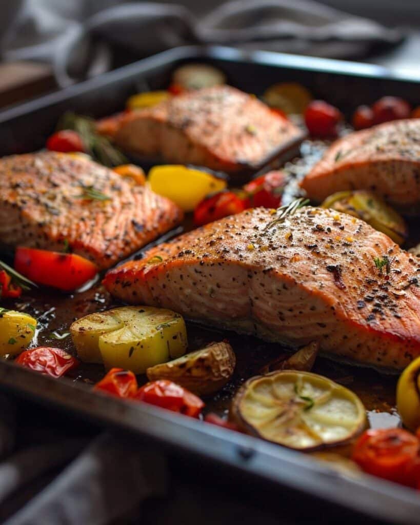 A simple and healthy one-pan meal featuring tender oven-baked salmon fillets alongside colorful roasted vegetables seasoned with herbs and olive oil.