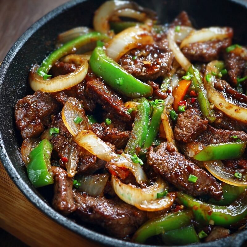 A classic Chinese stir-fry featuring tender strips of beef steak, crisp bell peppers, and sweet onions tossed in a savory, umami-rich sauce. This sizzling pepper steak is quick to prepare and bursting with flavor, perfect for an easy dinner.