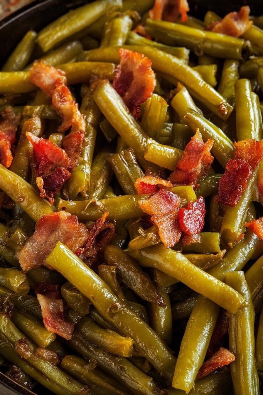 A savory Southern-style side dish inspired by Texas Roadhouse, these green beans are slowly simmered with bacon, onions, and a flavorful broth for the perfect comforting addition to any meal.